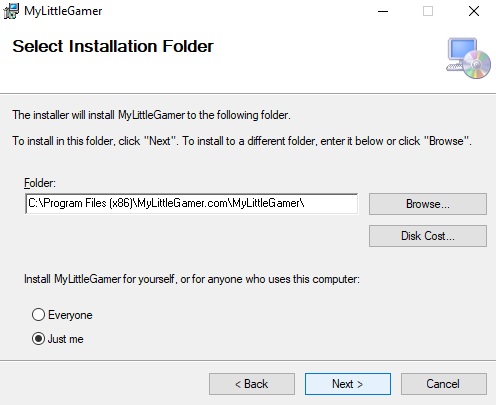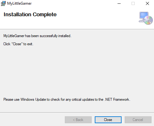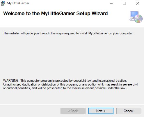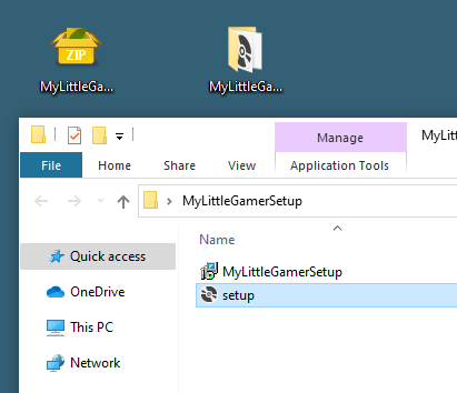 The ZIP archive contains the installation files "setup.exe" and "MyLittleGamerSetup.msi.".