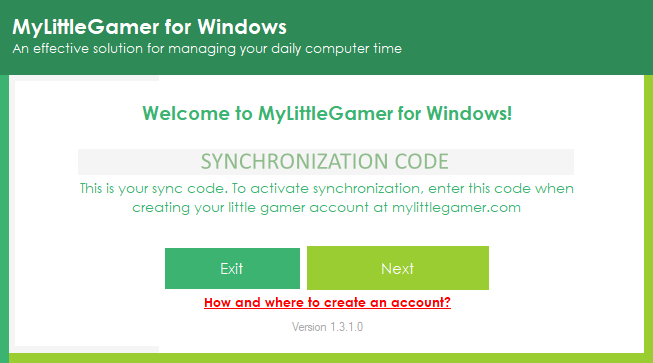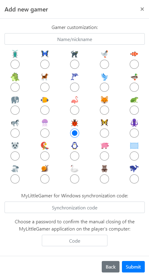 Enter the name/nickname of the new gamer, choose an icon that suits your gamer, enter your unique sync code displayed in the app you previously installed, choose any password used to manually exit the app, and click the "Submit" button.